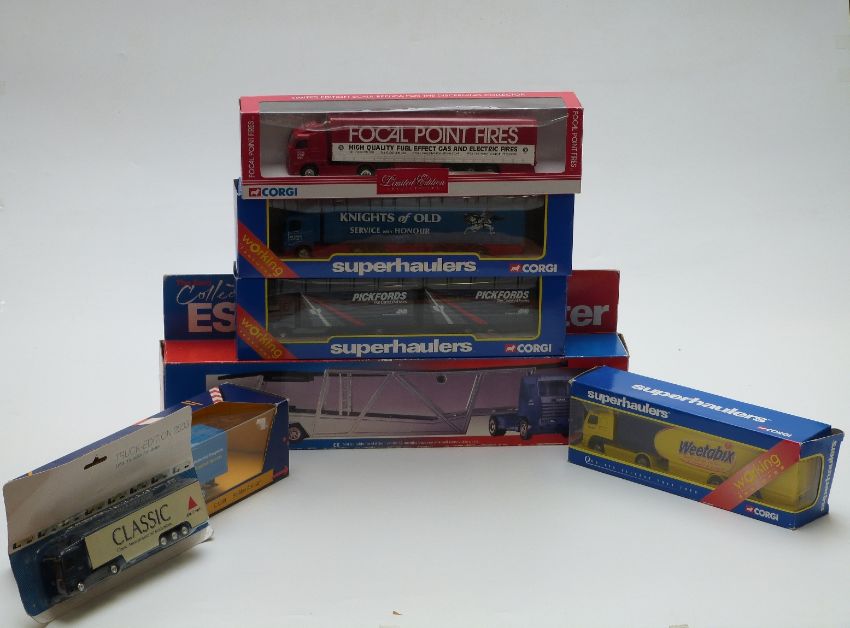 Seven Corgi Superhaulers and similar diecast model lorries including Pickfords, Knights of Old, Focal Point Fires etc, some limited edition, all in original boxes