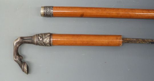A 19thC swordstick with horse hoof finial. Damascene triangular concave blade with J E Moll mark. 90cm.