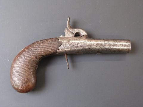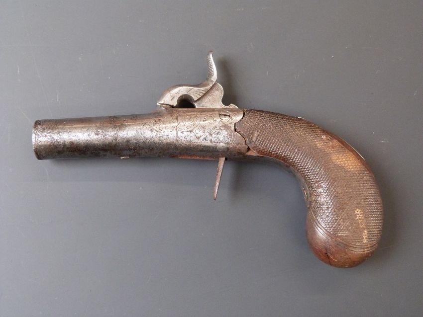 Unnamed 54 bore percussion hammer action muff pistol with engraved decoration, folding trigger, chequered grip , vacant wrist cartouche and 1.75 inch turn off barrel, overall length 15.5cm.