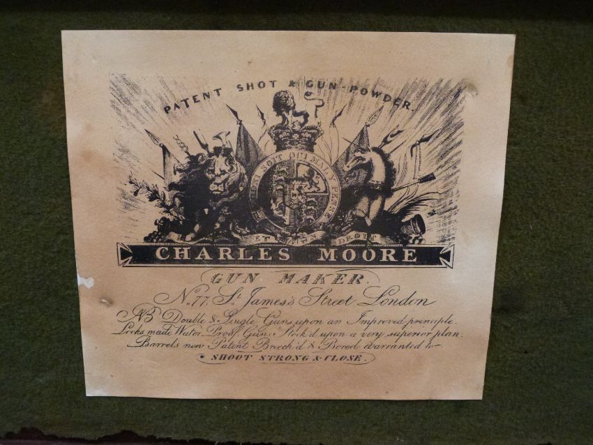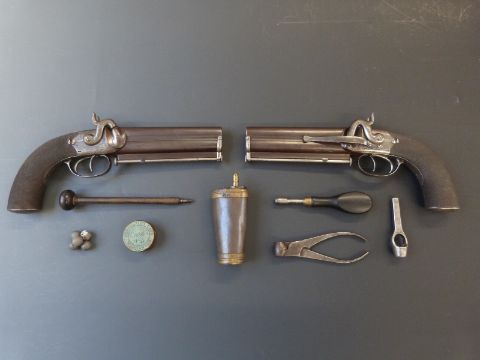 A cased pair of Moore & Woodward 36 bore over and under percussion hammer action belt pistols both with scrolling engraving to the locks, hammers, butt cap, top plate and trigger guard, captive steel ram-rod thumb slide safety, vacant cartouche to the chequered grips, double triggers, storage compartment to butt and 5 inch barrels engraved 'Moore & Woodward St James St London', overall length 29cm, in fitted brass bound mahogany case with powder flask, wad punch, bullet moulds, nipple key, cleaning rod, percussion caps, bullets and Charles Moore label.