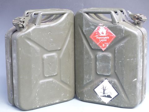 Two modern military jerry petrol cans, each marked with broad arrow and date 2009