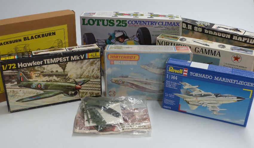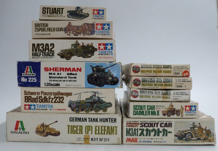 Eight Tamiya, Max and Italaerei 1:35 scale model military vehicle kits including Sherman Tank No 225, Tiger Elefant 211, M3A2 Halftrack MM170, M3A1 Scout Car 3507-900 and Schwerer Panzerspahwagen MM136 together with three boxes of Airfix 1:32 British 8th Army figures, all in original boxes