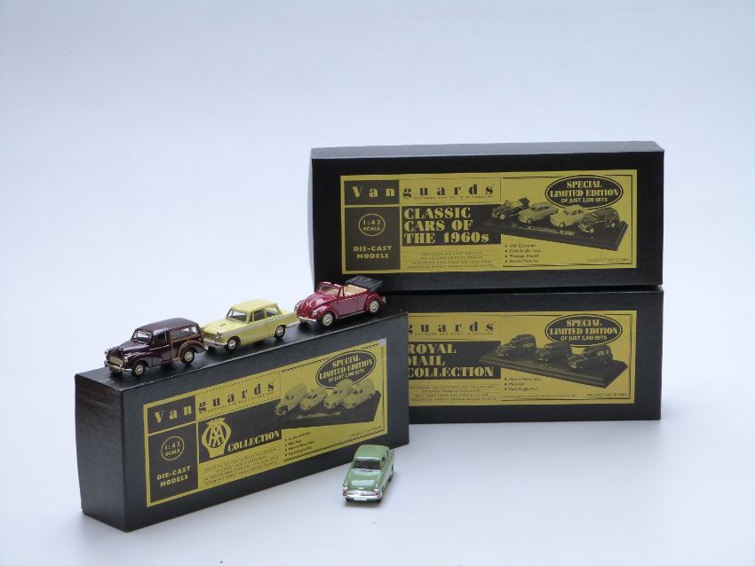 Three Vanguards 1:43 scale special limited edition diecast model vehicle sets Royal Mail Collection RM1003, AA Collection AA1004 and Classic Cars of The 1960's CC2004, all in original boxes