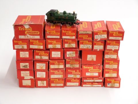 Thirty eight Tri-Ang 00 gauge locomotives, coaches, wagons and accessories, all but one in original boxes