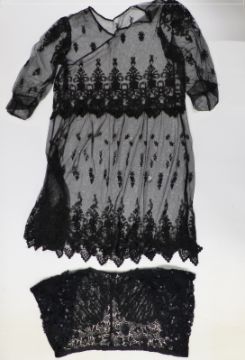 A collection of textiles to include vintage evening dresses, a silk shawl, a lace trimmed bed cover, felt hat in vintage hat box, kid gloves etc