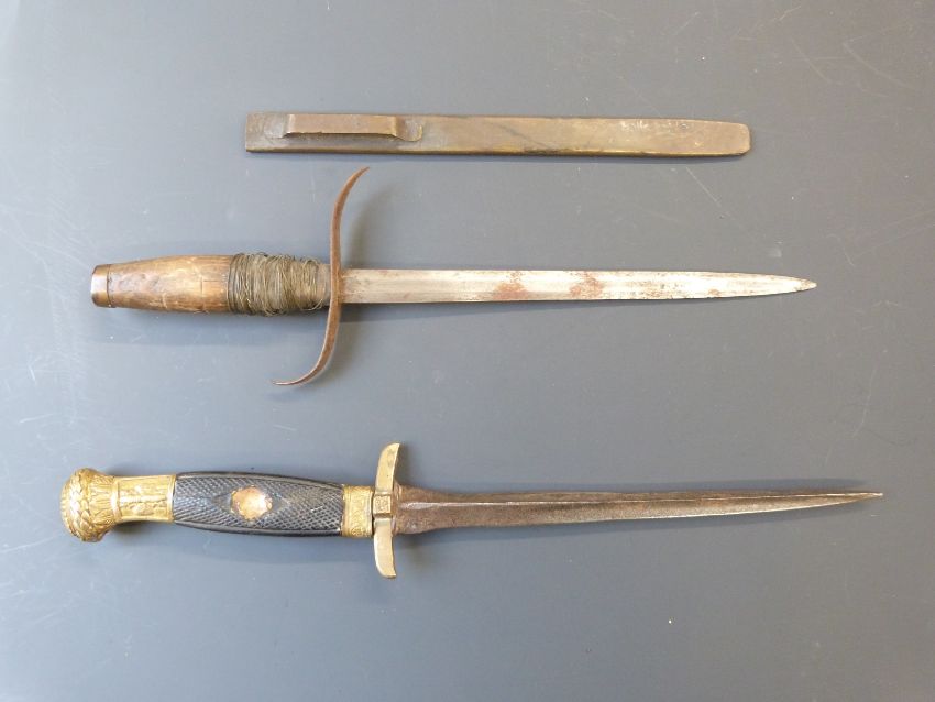 French WWI trench/fighting knife 'Le Vengeur' style, with sheath, blade length 16cm, together with another ornate example, blade length 19cm.
