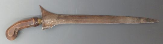 Sumatran Kris dagger with 14 inch Damascus blade, carved handle and gilt mendak, overall length 46cm.