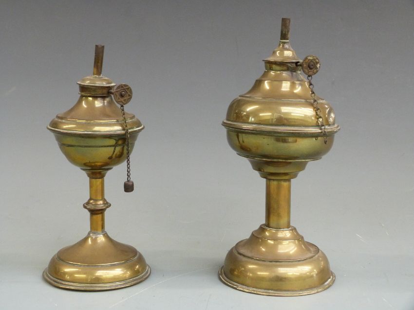 Two small brass oil lamps, one with Star of David to the wick adjustment knob, tallest 22cm