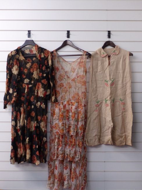 Three Edwardian day dresses, two floral chiffon and one embroidered linen