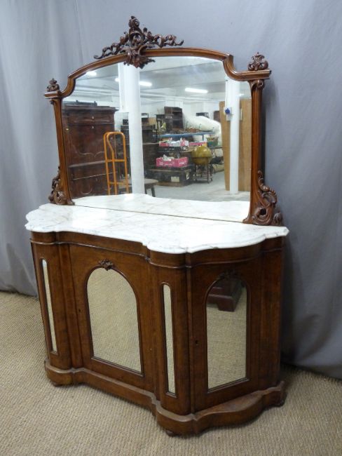 Victorian burr walnut mirror-backed, marble-topped credenza, having arch top mirrors to each door and line inlaid decoration, W151 x D48 x H187cm