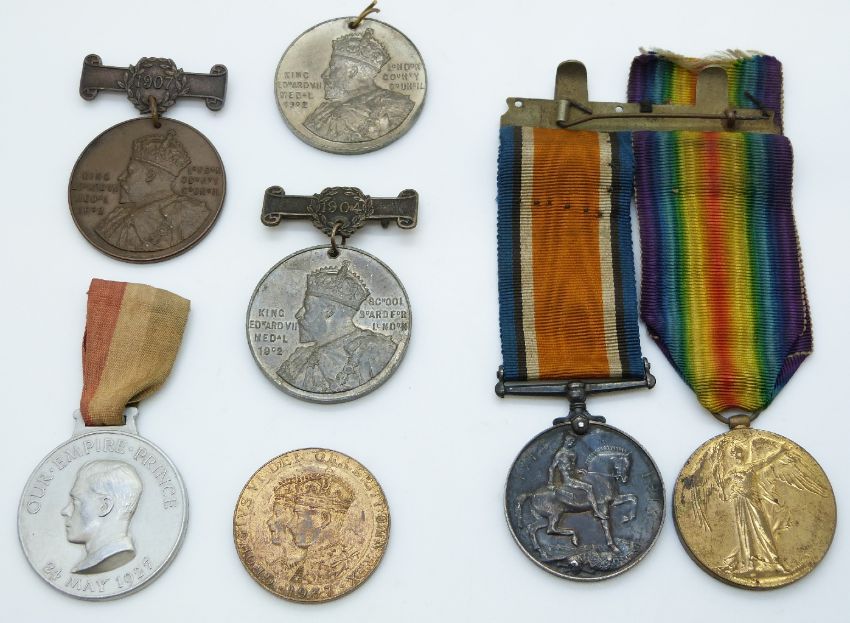 British Army WWI medals comprising War Medal and Victory Medal named to 906717 CPL.C.S.Morris R.A.together with School Board for London Attendance Medal and two London County Council Attendance Medals, Empire Day Medal 1927 and a 1937 Coronation Medal