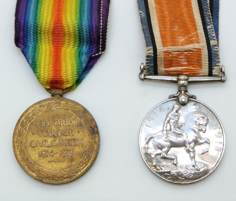 British Army WWI medals comprising War Medal and Victory Medal, named to 37910 Pte A Mathews, Gloucestershire Regiment