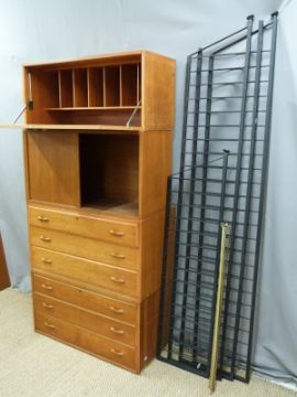 AUCTIONEER ANNOUNCE - THESE LOTS WERE DESCRIBED THE WRONG WAY AROUND IN THE PRINTED CATALOGUE ONLY - THE BELOW DESCRIPTION IS CORRECT. Ladderax retro drawer, cupboard and bureau wall unit comprising two sets of three drawers, each W89 x D42 x H47cm, sliding door cupboard W89 x D35 x H47cm and bureau W89 x D35 x H40cm, eight support rods and four metal ladder frames, three 201 cm tall the other 133cm tall