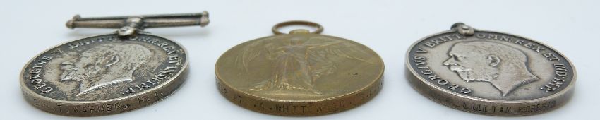 British Army WWI medals comprising two War Medals named to William Roberts and to 81596 Gunner T.Warner, Royal Artillery together with a Victory Medal named to 203282 PTE. A. Whitehead, South Lancashire Regiment