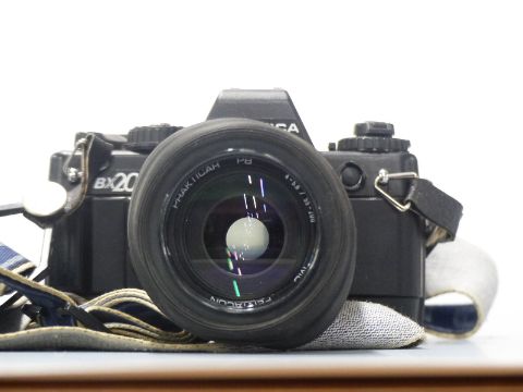 Olympus OM-2 SLR camera with 50mm 1:1.8, 28mm 1:3.5 and 200mm 1:4 lenses and Praktica BX20 SLR camera with 4-5.6 55-200mm Pentacon lens