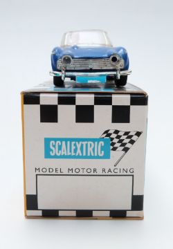Tri-ang Scalextric model motor racing/ slot car Triumph TR4A racing car with blue body, beige interior, chrome bumpers and hubs, white driver with red hat, race tuned decals and racing number 8, C84, in reproduction box.