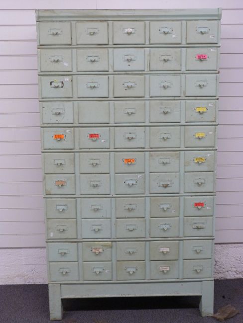Large bank of 55 drawers to suit shop fitting or haberdashery, built in a Globe Wernicke style with base and 3 double height and five single height banks, W106 x D46 x H193cm