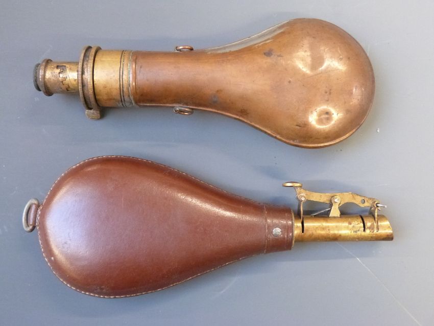 Sykes copper and brass powder flask with suspension loops (20cm long) together with a leather and brass shot flask with embossed decoration of a dog and suspension loop (22cm long).