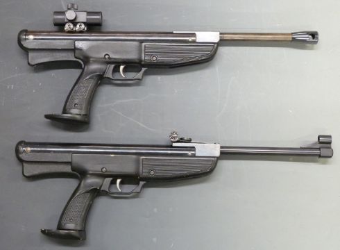 A pair of Gamo target air pistols one .177 serial number F68299 the other .22 with Tasco MM25 Minimag Red Dot sight, serial number H02631, in fitted wooden carry case