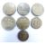 Seven George III brass coin weights for gold sovereign, half sovereign, half guinea etc, one with profile bust, dated 1775 rev, others include 1772 example, 5 DWT 6 GR etc