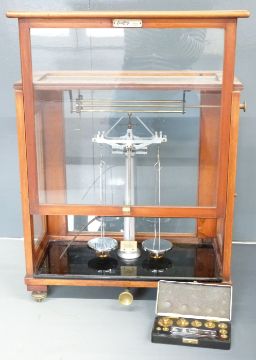 Two cased sets of laboratory scales, both marked L.Oertling London EC, width of each approximately 45cm, together with cased weights