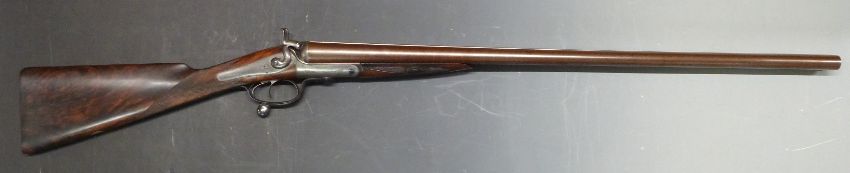 John Dickson & Son 8 bore side by side hammer action shotgun with named and engraved locks, engraved hammers, trigger guard and rotary underlever, chequered grip and forend, vacant cartouche to the underside of the stock, double trigger and 32.75 inch Damascus barells engraved 'John Dickson & Son 63 Princess Street Edinburgh', overall length 127.5 cm, serial number 3156.
