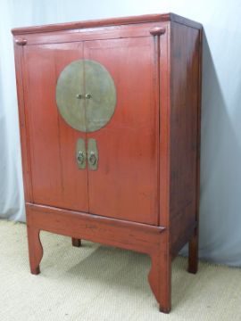 Chinese red lacquer cupboard with brass mounts, the interior with two drawers, shelves and secret compartment to base, W112 x D62 x H179cm