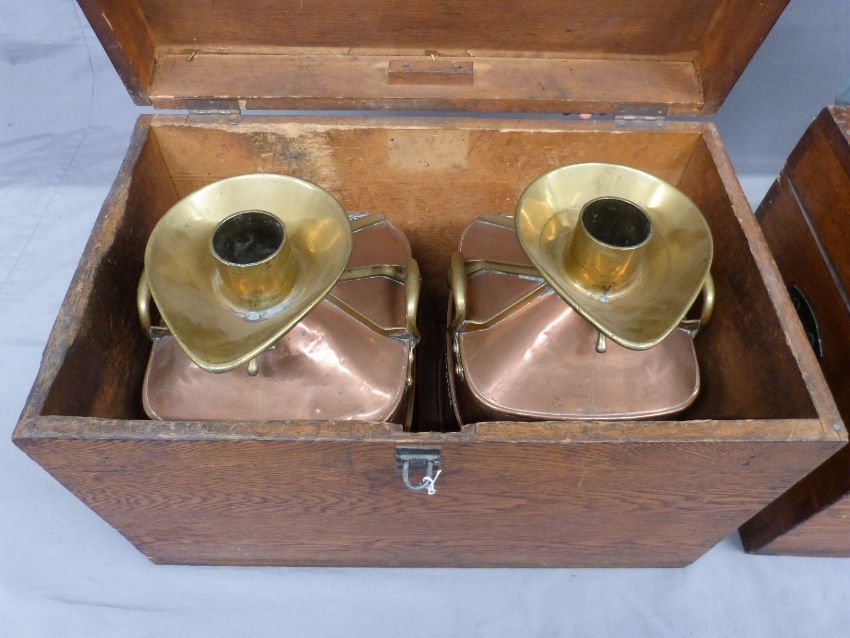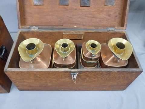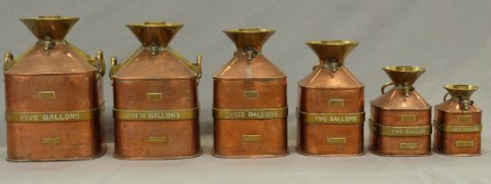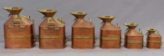 Boxed set of six Monmouthshire County Council "Chekpump" petrol measures by Gaskell & Chambers Ltd comprising five, four, three, two, one and half gallon examples, each with Monmouthshire County council and capacity to sides, contained in two large carrying boxes each marked Petrol Measures Monmouthshire County Council B.H.Bell London, ex Monmouthshire Trading Standards