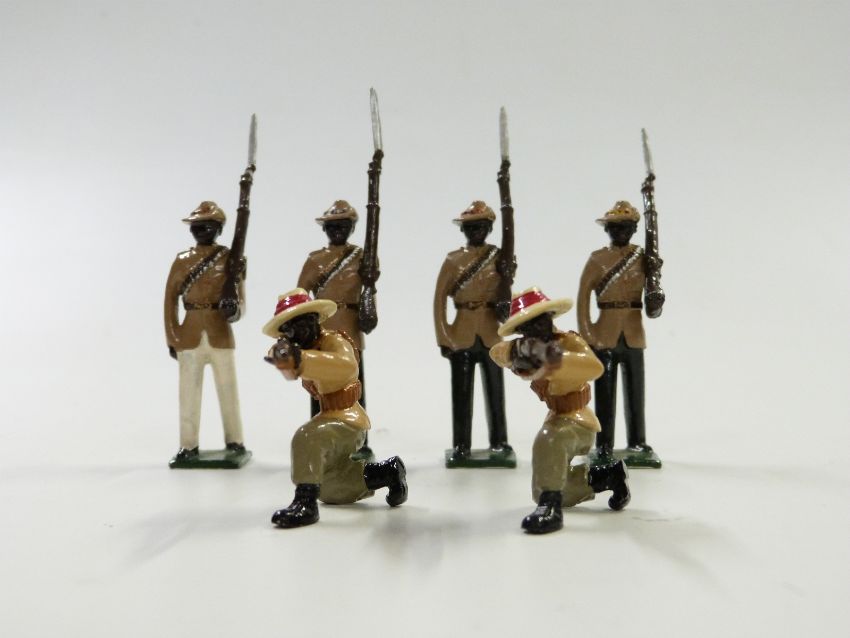 Nine Britains diecast model soldiers comprising six Gurkhas and three Queen's Guards on original stand