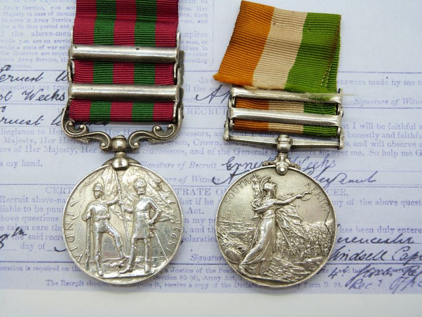 British Army India medal (1896) with two clasps, Tirah 1897-98 and Punjab Frontier 1897-98 and King's South Africa medal with 1901 and 1902 clasps named to 2522 Pte. E. Weeks Devonshire Regiment, with copy paperwork. Ernest Weeks was born in Cirencester, Gloucestershire and enlisted in April 1889 aged 18, he served in Egypt, India and South Africa.