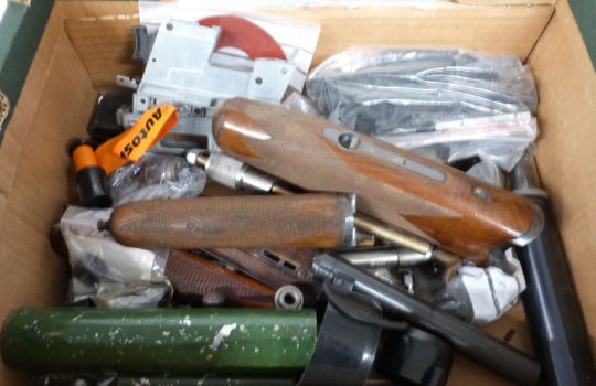 A collection of gun parts and accessories including forends, sound moderators, magazines, springs, ladder sights, etc. PLEASE NOTE THAT A VALID RELEVANT RFD CERTIFICATE IS REQUIRED TO HANDLE/PURCHASE THIS ITEM.