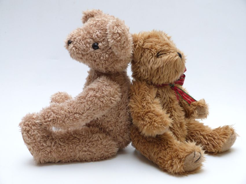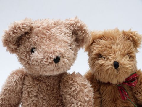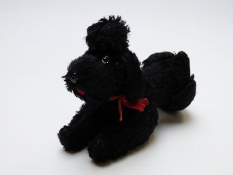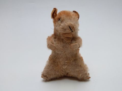 Five various Teddy bears including a Steiff style hamster with blonde mohair and straw filled body, a similar black dog, Rupert Bear, TY soft bear and one other, largest 45cm tall