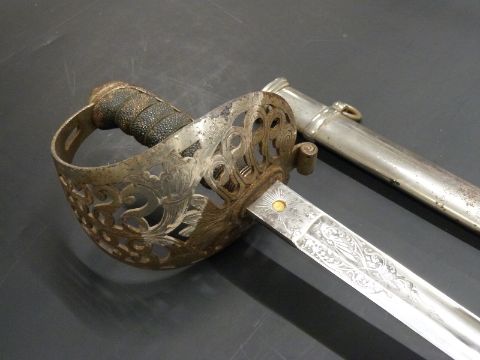British Army 1821 pattern Heavy Cavalry officer's sword, by Robert Mole and Sons, Birmingham, proof mark and Queen Victoria cipher to 89cm blade, serial number M3393, with metal scabbard