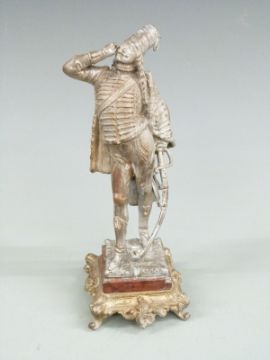 Three novelty dog soldiers depicted as musicians, 25cm tall, together with the 'Listening' Hussar