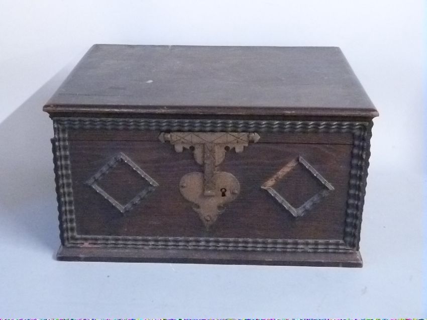 Brass bound walnut writing slope, width 45cm, together with two further boxes, keys, whistle etc