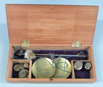 Two sets of 18thC / 19thC travelling beam scales both with Avery troy ounce weights. Width of larger case 20cm