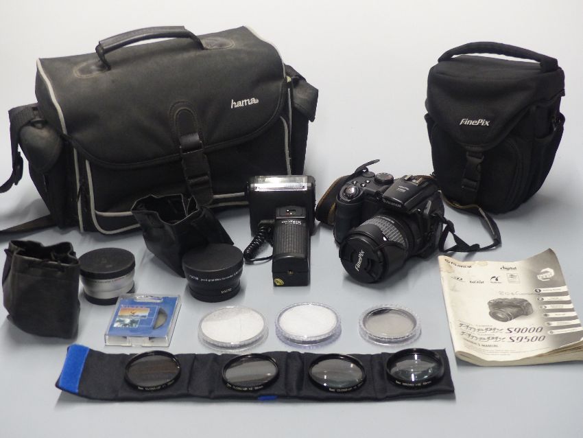 Fujifilm Finepix S9500 digital camera fitted with 28-300mm lens, two converters, one marked macro, further acessories etc