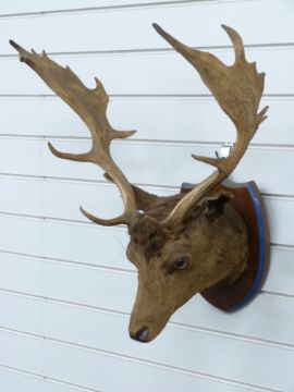 Taxidermy study of fallow deer buck head with 18 point antlers mounted on shield shaped wooden plaque, 66cm from tip of antlers to nose.