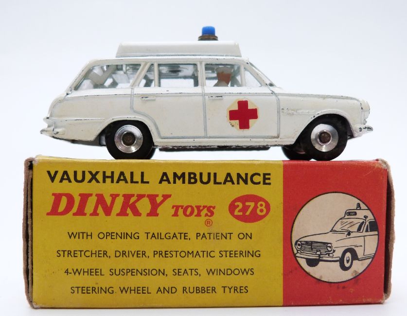 Dinky Toys diecast model Vauxhall Ambulance with white body, green interior, white driver, blue light and spun hubs 278, in original box.