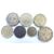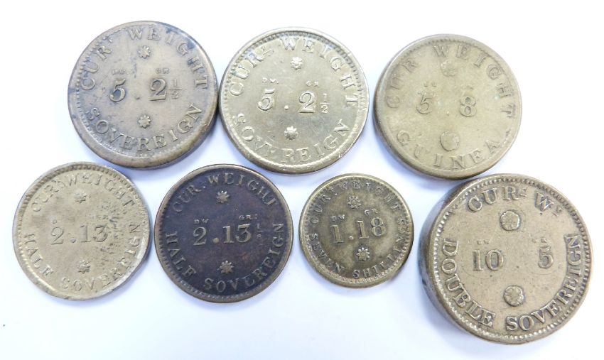 Seven George IV Royal Mint milled brass coin weights for gold double sovereign dated 1823, sovereigns x2, guinea, half sovereign x2 and seven shillings all dated 1821