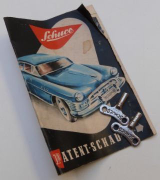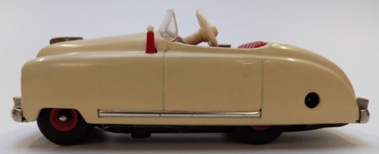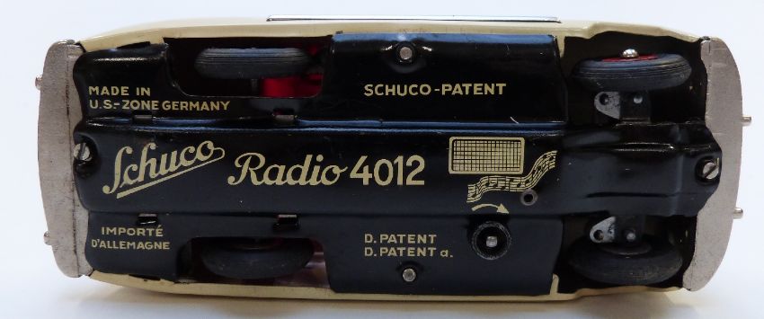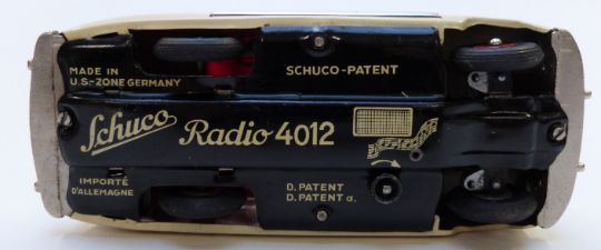 Schuco Radio 4012 clockwork tinplate car car with cream body and red interior containing a Thorens music box movement, in original box with two keys and instructions.
