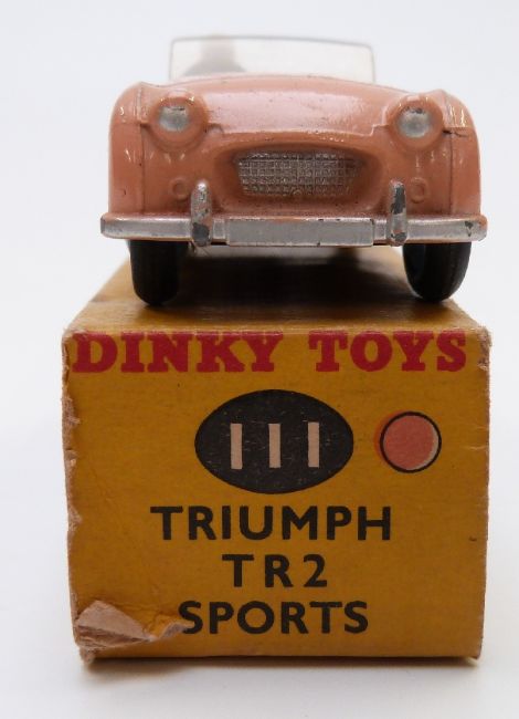 Dinky Toys diecast model Triumph TR2 Sports with salmon body, blue interior and white driver 111, in original box.