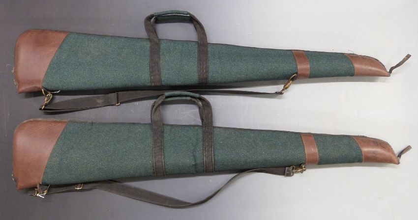 Two Napier of London padded leather and canvas shotgun slips with shoulder strap, 127cm long.