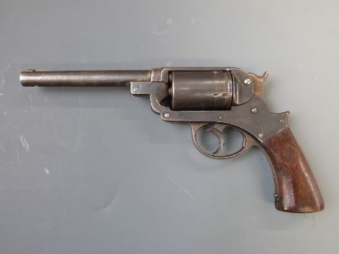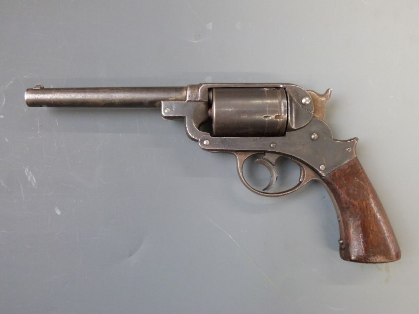 Starr Arms Co. New York 10.6mm five-shot double action percussion centre fire revolver with steel frame stamped to one side 'Starr Arms Co New York' and to the other 'Starr's patent Jan 15 1856', shaped mahogany grip and 6 inch barrel, overall length 33.5cm, serial number 2609.