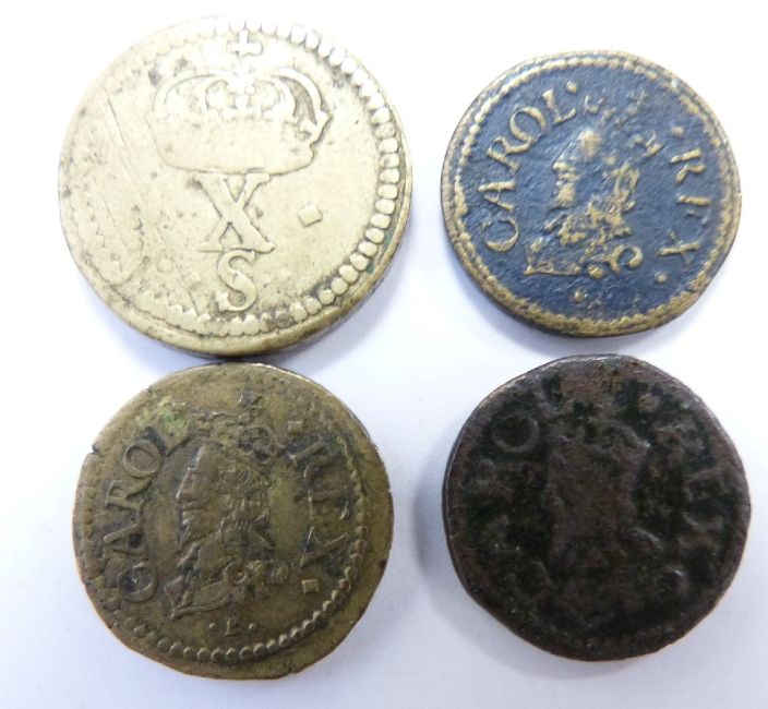 Four Charles I brass coin weights for gold coins, one for ten shillings and three for five shillings, CAROLUS, Rex with King's left facing bust obverse, reverse with crown over XS or VS