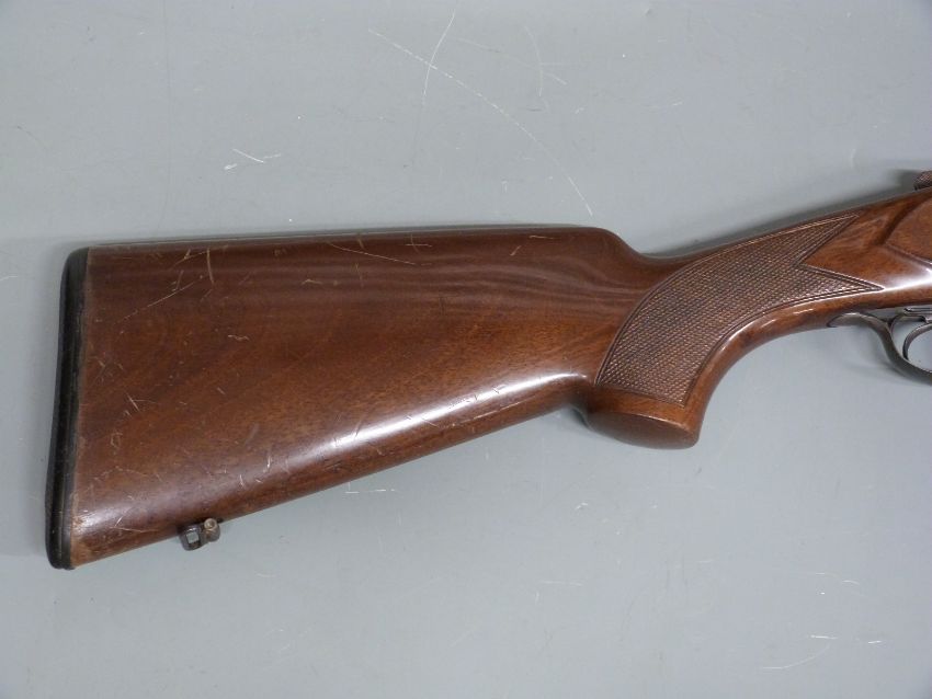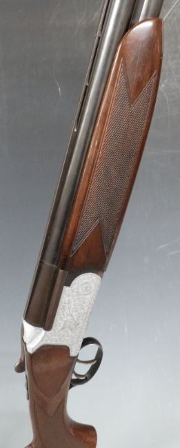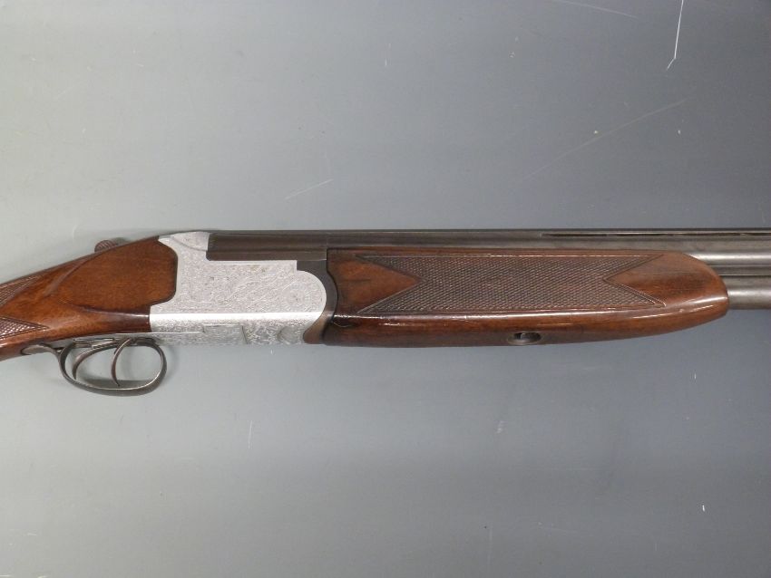 Fabarm 12 bore over and under shotgun with engraved scenes of dogs to the named locks, all over scrolling engraving, double trigger, chequered semi-pistol grip and forend, sling suspension mounts, vented top rib and 27.5 inch barrels, choked ¾ and full overall length 111cm, length of pull 36cm, serial number 86874. PLEASE NOTE THAT A VALID RELEVANT FIREARMS/SHOTGUN CERTIFICATE IS REQUIRED TO HANDLE/PURCHASE THIS ITEM.