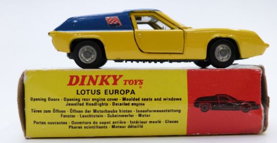 Dinky Toys diecast model Lotus Europa, with yellow body, blue roof and side panels, gold engine and chequered flags, 218, in original box.