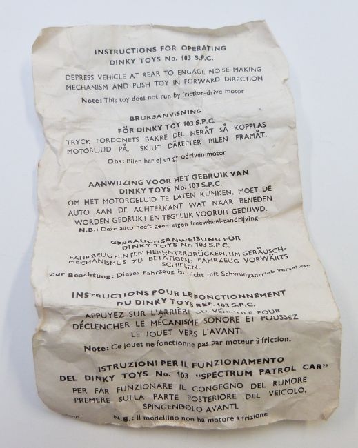 Dinky Toys diecast model Captain Scarlet Spectrum Patrol Car with turbo-jet engine sound, suspension, red body, yellow interior and decals to doors 103, in original box with instructions.