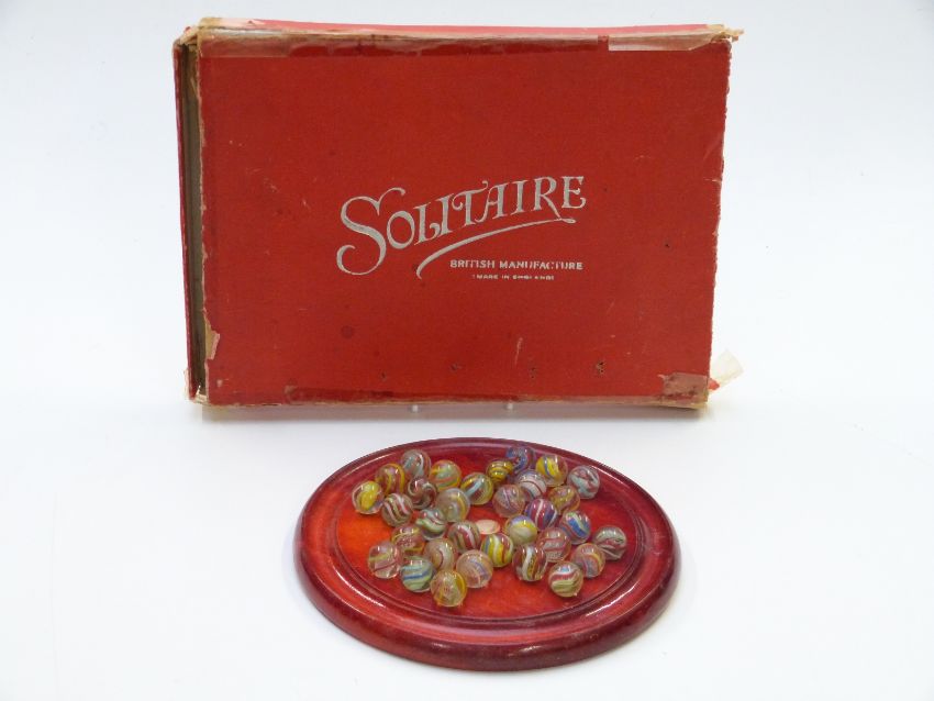 Thirty-two glass marbles all with multi-coloured twists each approximately 15mm in diameter, on a wooden solitaire board, in original box