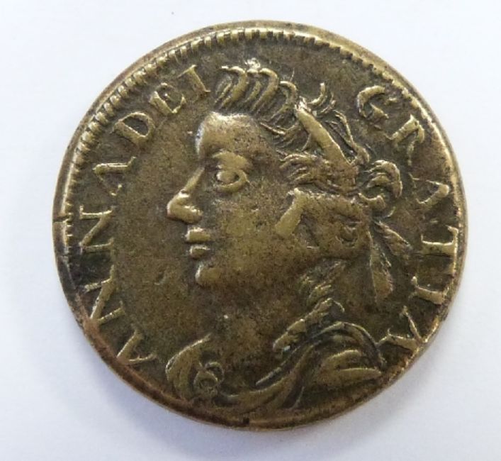 Queen Anne brass coin weight for one gold guinea, left facing bust obverse, crown and crossed sceptres reverse